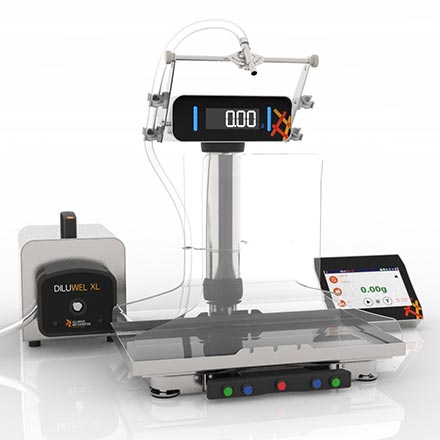 Dilutor Gravimétrico de Una Bomba para Grandes Volúmenes - Incluye: Cabezal Motorizado con Soporte, Manual de Usuario, Bomba, Tablet con Touchscreen, Balanza de Precisión, Bandeja de Pesado, Cable de Alimentación, 1 Set de tubos de 10 mm de diam y Certificado de control de Calidad.